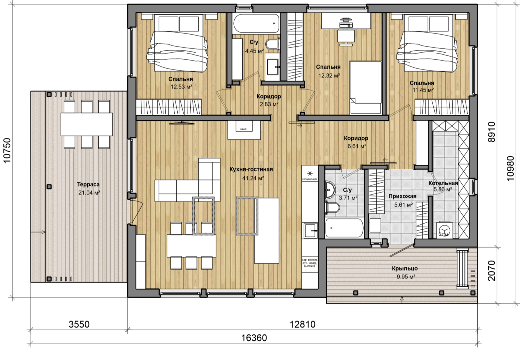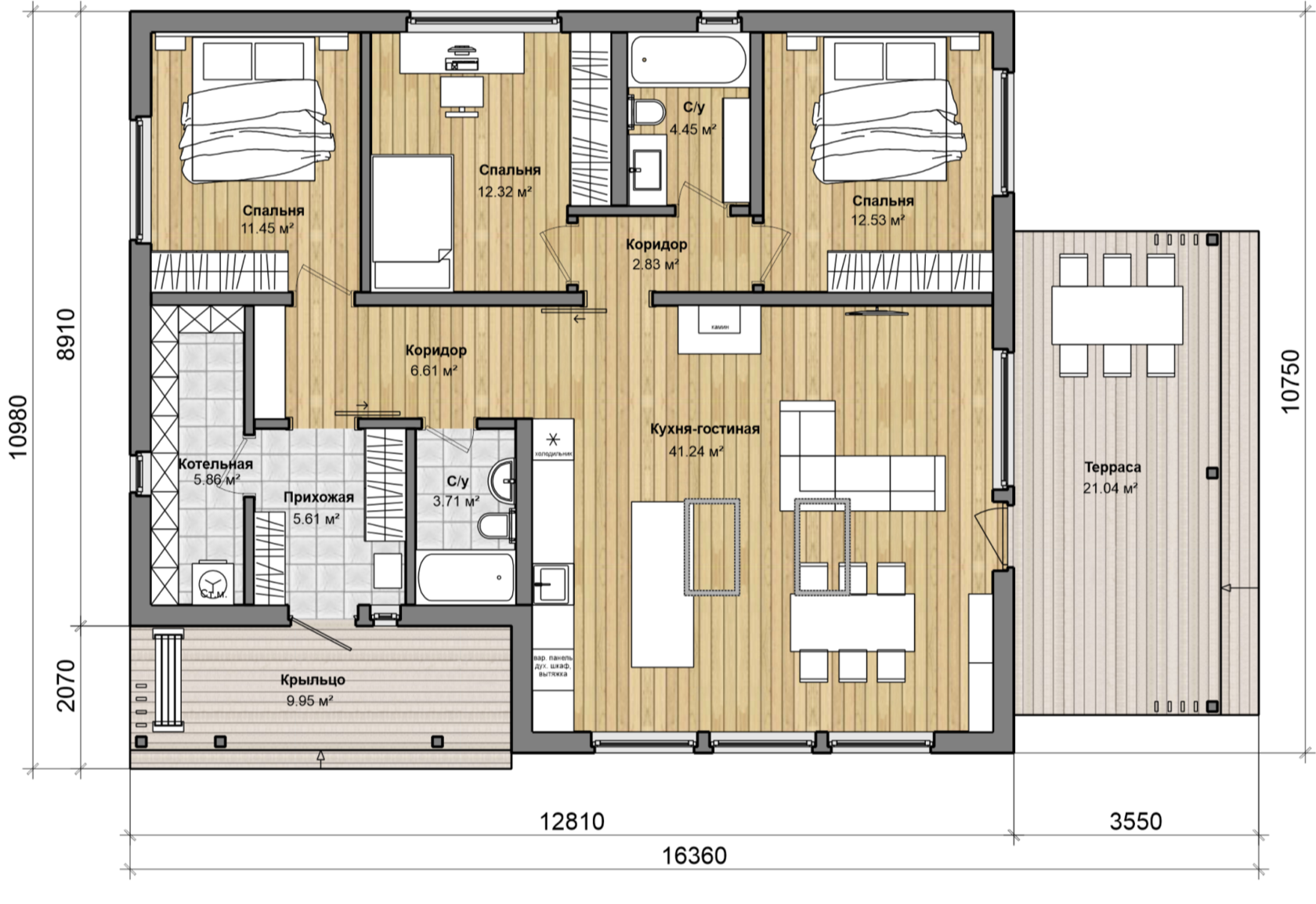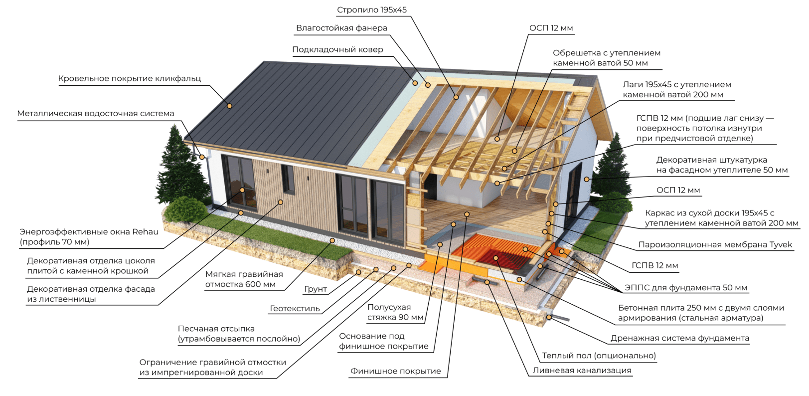 Внешние стены снаружи обшиты плитами МДВП 25 мм. Это мягкие плиты из древесного волокна, которые защищают стены от попадания влаги снаружи. Но у них есть еще несколько плюсов. Плиты МДВП являются утеплителем, по свойствам таким же как минеральная вата. Плюс, они паропроницаемы. То есть — даже если по каким-то причинам в стену попала влага, она легко выйдет через МДВП и проветрится через вентзазор. В такой конструкции стены нет шансов для образования плесени