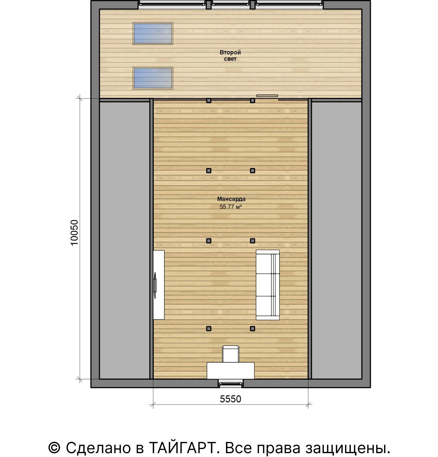 Домокомплект заводского производства из сухой строганой доски. Включает внешние и внутренние стены и панели перекрытия. Утепление 225−250 мм