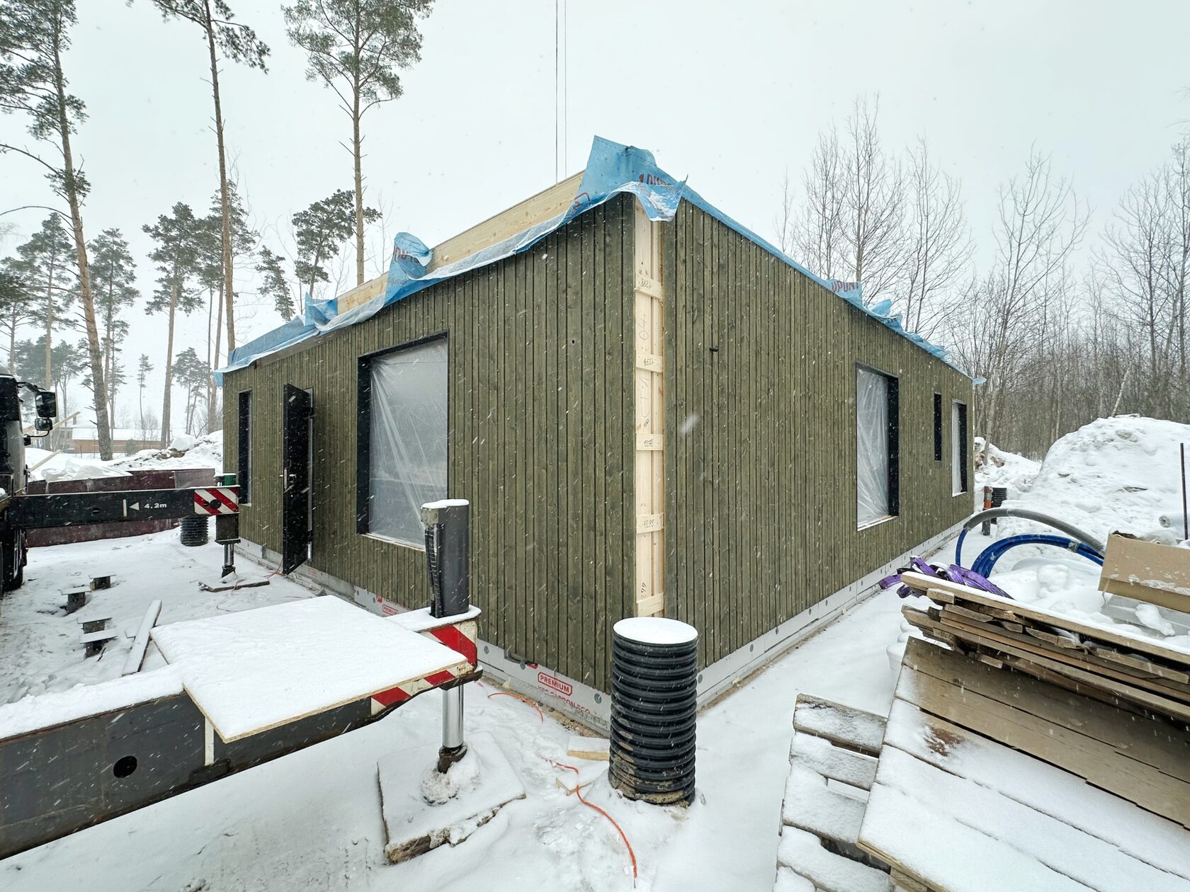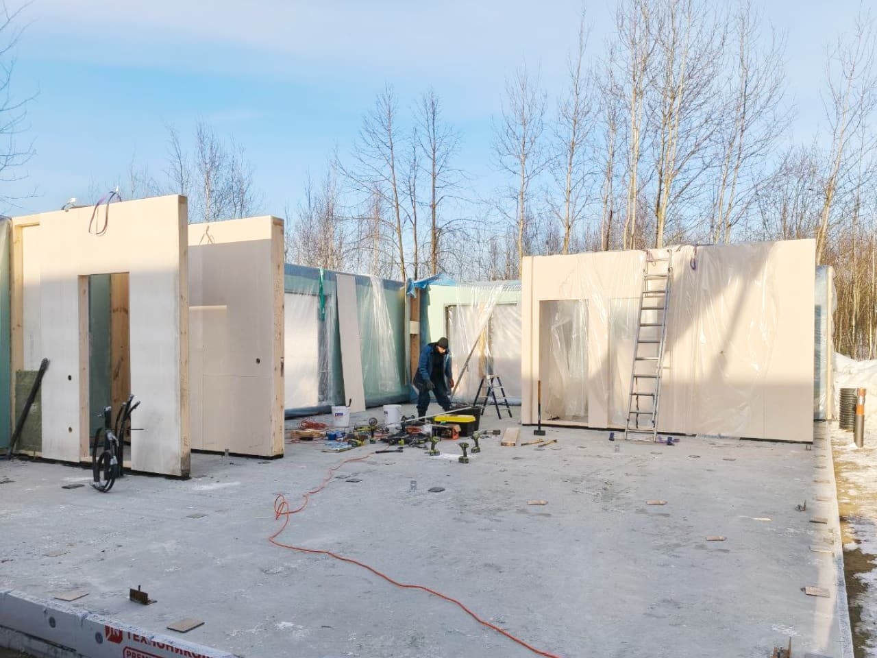 Началась сборка теплого контура дома. Благодаря тому, что получилось подъехать в плотную к участку для разгрузки стен, манипулятор не понадобился - работает только кран