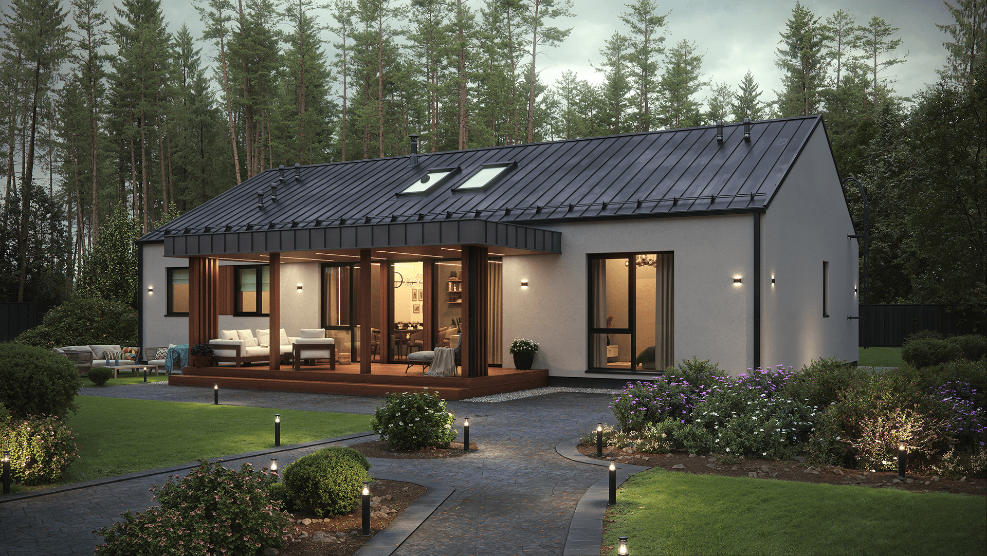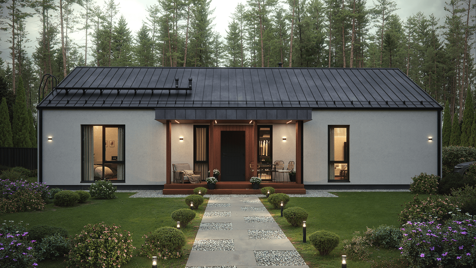 - на представленной визуализации дом без свесов крыши, но мы также можем сделать стандартные свесы;